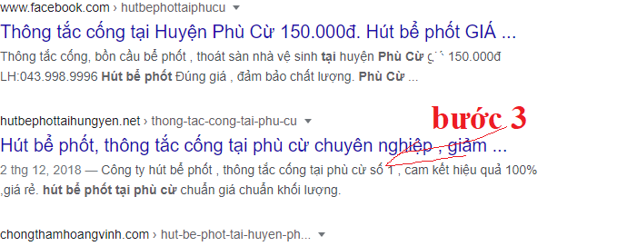 Bước 2: bạn gõ theo từ khóa ” hút bể phốt tại phù cừ ,thông tắc ocongs tại phù cừ …”. Lúc đó bạn sẽ thấy rất nhiều thông tin về dịch vụ và thấy ngay trên đầu của thông tin là các quảng cáo. Bạn bỏ qua những thông tin có chữ quảng cáo đó nhé